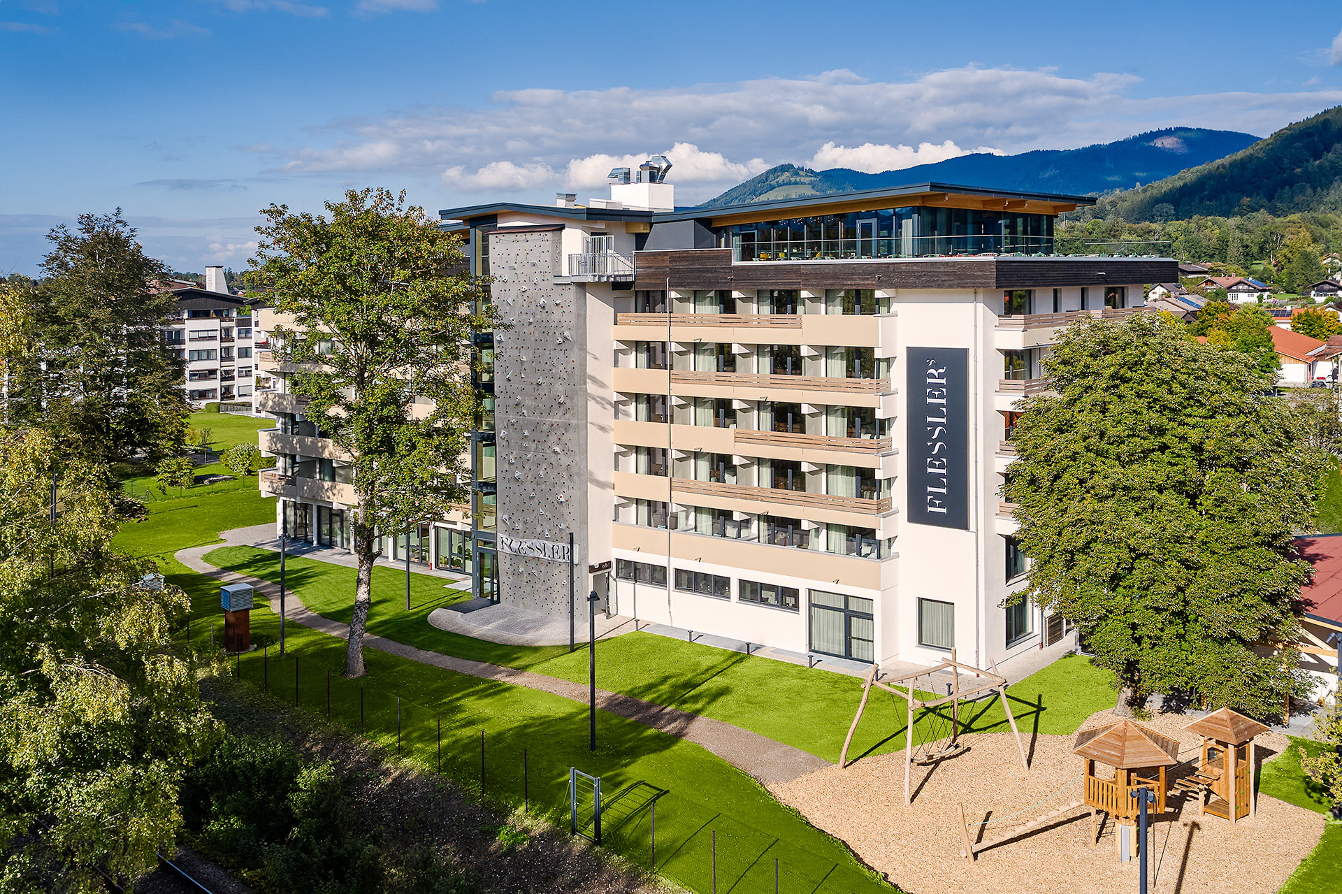 Ein echtes Highlight im Flesslers: die 20 Meter hohe Kletterwand direkt am Hotel. Ob als sportliches Rahmenprogramm, für Teambuildings oder private Feiern – mit professioneller Betreuung wird sie zum Erlebnis für Einsteiger wie Profis. So verbinden sich Teamgeist, Sport und Event zu einem außergewöhnlichen Moment.